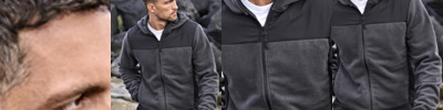 Two layer soft shell. 97% polyester/3% spandex outer layer bonded with polyester fleece. Four-way stretch fabric. H2XTREME® waterproof 5000mm and breathable 5000g membrane. Concealed hood. Full length zip with chin guard and inner zip guard. Left sleeve zip pocket. Inner security zip pocket. Media port. Two front zip pockets. Tear release adjustable cuffs. Drop hem with adjustable drawcord. Branded. Access for decoration.