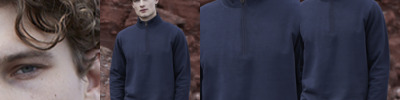 85% organic combed cotton/15% recycled polyester. Brushed back fleece. Enzyme washed. Straight fit. Jersey taped neck. Zip neck with recycled metal zip. Half moon back yoke. 1x1 ribbed cuffs and hem. Twin needle cuffs and hem. Tag free. Recycled polyester is made from post-consumer waste.