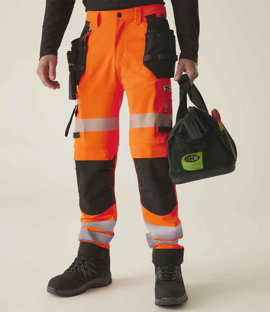63% polyester/30% recycled polyester/7% elastane. Woven stretch fabric. Certified to EN ISO 20471:2013 A1:2016 Class 2. RIS-3279-TOM (orange only). Slim Fit Water repellent finish. Part elasticated waistband. Shaped high back waistband. Zip fly with button over. Detachable holster pockets with slide system for optional use. Multi function tool and mobile phone pockets to legs. 15 pockets. Cordura® top loading knee pad pockets. Heat applied segmented tape. Reflective detail for enhanced visibility. Extendable hem offering a choice of leg lengths. Knee pads available RG282.