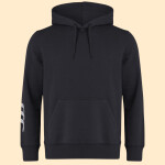 55% cotton/45% polyester. Drop shoulder style. Jersey lined hood with self colour drawcord. Forward facing shoulder seams. Front pouch pocket. Ribbed cuffs and hem. Branding on lower right sleeve.