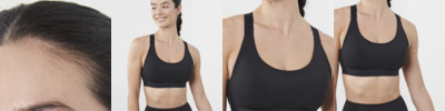 86% polyester/14% elastane interlock. Medium support sports bra. Round neckline. Cross over elastic adjustable back strap detail. Elastic band with bra clasp closure. Permanent cup insert. Tear out label.
